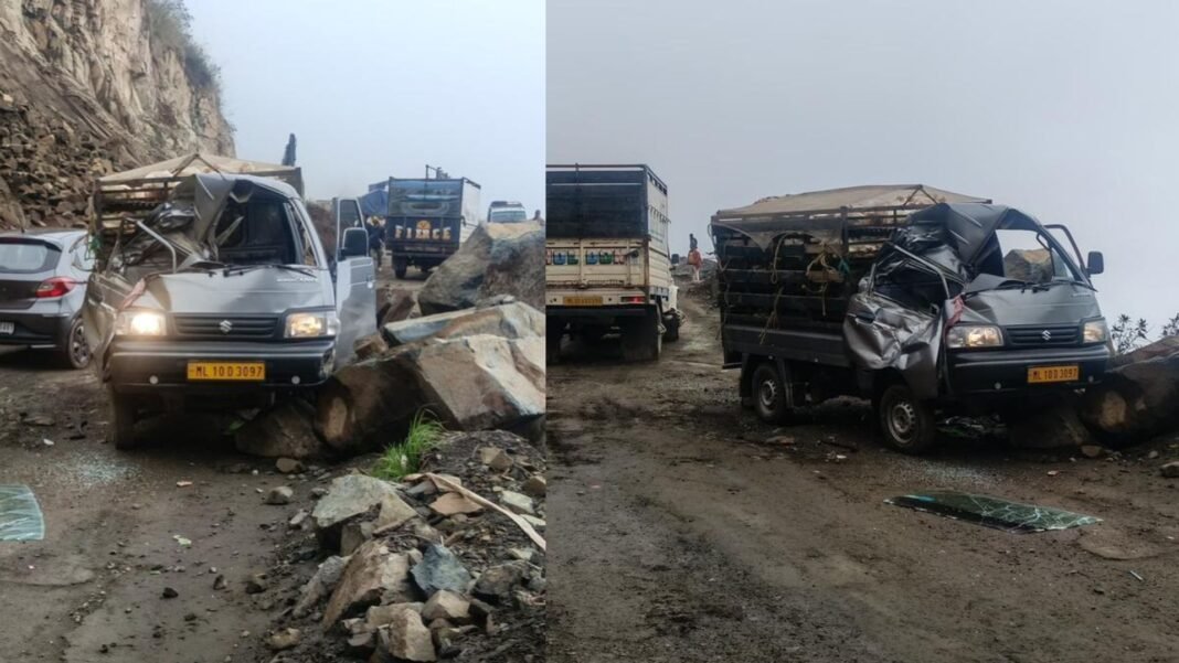 Shillong, March 30: A Super Carry camper vehicle was badly damaged after being hit by a landslide at Laitlyngkot along the NH-40 Shillong–Pynursla–Dawki road on Monday morning.