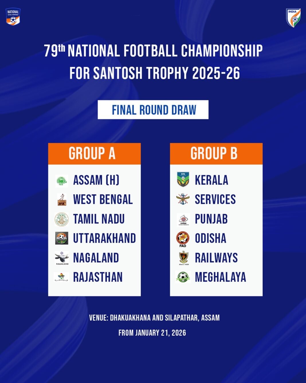 Shillong/Guwahati: Meghalaya will have to deliver top-class performances after being drawn into a formidable Group B for the final round of the 79th Senior Men’s National Football Championship for the Santosh Trophy 2025–26. The draw, conducted on 31 December at the All India Football Federation (AIFF) headquarters in New Delhi, has placed Meghalaya alongside Kerala, Services, Punjab, Odisha and Railways.