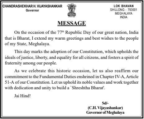 MEGHALAYA Message By T7 News January 27, 2026 0 17 Share FacebookTwitterPinterestWhatsAppEmailPrintTelegram HEADLINES Assam–Meghalaya Border situation improves; Issues at Maikhuli resolved: Dy CM Tynsong January 27, 2026 New Meghalaya Assembly Building nears completion; June deadline holds January 27, 2026 Republic Day Celebration 2026 at Shillong January 27, 2026 Message January 27, 2026 T7 News Share FacebookTwitterPinterestWhatsAppEmailPrintTelegram Previous articleMessageNext articleRepublic Day Celebration 2026 at Shillong - Advertisement - More articles Assam–Meghalaya Border situation improves; Issues at Maikhuli resolved: Dy CM Tynsong January 27, 2026 New Meghalaya Assembly Building nears completion; June deadline holds January 27, 2026 Republic Day Celebration 2026 at Shillong January 27, 2026 LEAVE A REPLY Cancel reply Comment: Please enter your comment! Name:* Please enter your name here Email:* You have entered an incorrect email address! Please enter your email address here Website: Save my name, email, and website in this browser for the next time I comment. - Advertisement - TRENDING Assam–Meghalaya Border situation improves; Issues at Maikhuli resolved: Dy CM Tynsong January 27, 2026 New Meghalaya Assembly Building nears completion; June deadline holds January 27, 2026 Republic Day Celebration 2026 at Shillong January 27, 2026 Message January 27, 2026 Message January 27, 2026