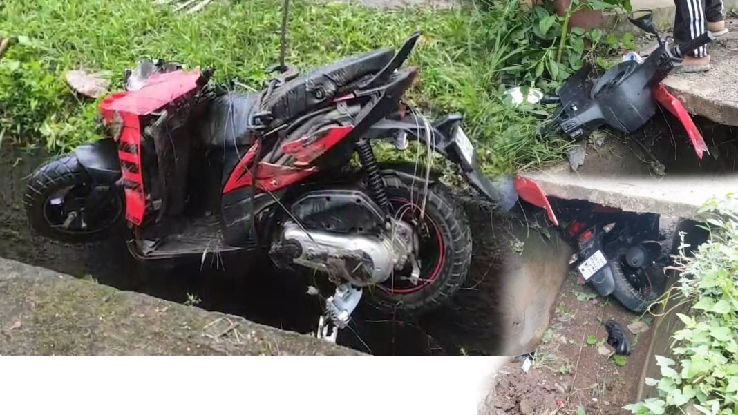 According to eyewitnesses, the scooty, suspected to be speeding, veered off course and rammed into the drain, with the vehicle’s front section getting completely wedged inside.